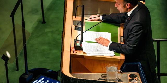 Emmanuel Macron lors de son discours annonçant la reconnaissance de l’Etat de Palestine par la France à la tribune des Nations unies, à New York, le 22 septembre 2025. BIANCA OTERO/ZUMA/SIPA