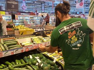 La Fédération départementale des syndicats d’exploitants agricoles (FDSEA) et les Jeunes Agriculteurs sont allés dans des supermarchés contrôler l’origine de certains produits. Direction d’abord le rayon primeur. Mais, surprise : beaucoup de fruits et légumes locaux sont mis en avant. « Ils étaient au courant de notre venue alors ils ont dû se préparer », imagine Damien Garrigues, le président de la FDSEA.