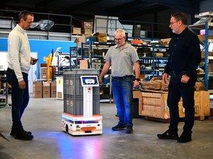 Ressemblant à une petite plateforme sur roues, Roc-e est capable d’aller seul, d’un bout à l’autre d’un entrepôt pour amener ou récupérer du matériel à l’aide de caisses posées sur son sommet. “Il ne remplace pas un humain et doit toujours être appelé par un humain”, précise le gérant.