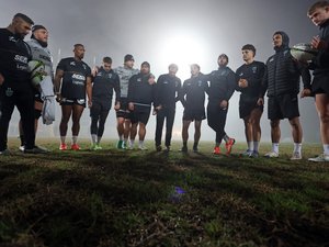 Les botteurs assurent leurs réglages avec Antoine Lanne-Petit, le coach des skills. Jérémie Maurouard travaille son lancer en touche, en envoyant des ogives vers Joe Snyman, son coach des avants, qui a trouvé refuge sur un gradin disposé du côté opposé à la tribune principale. Le manager, Sébastien Tillous-Borde, reste attentif.