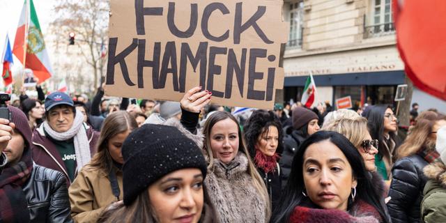 La présidente du collectif Némésis, Alice Cordier, brandit une pancarte condamnant le président iranien Khamenei lors d’une manifestation dénonçant la République islamique d’Iran à Paris, le 11 janvier 2026. QUENTIN DE GROEVE/HANS LUCAS VIA AFP