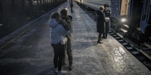 Un soldat ukrainien et sa compagne à la gare de Kramatorsk, en Ukraine, le 10 décembre 2023, vingt-deux mois après le début de l’invasion russe à grande échelle. MAREK M. BEREZOWSKI/ANADOLU VIA AFP