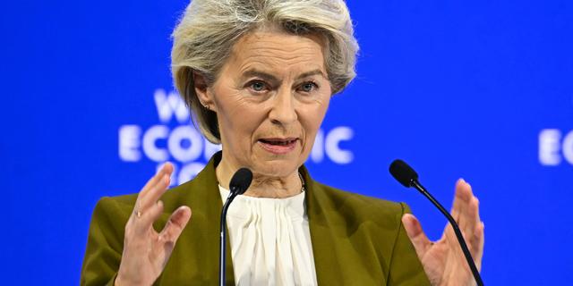 La présidente de la Commission européenne Ursula von der Leyen en train de délivrer un discours au Forum économique de Davos, le 20 janvier 2026. FABRICE COFFRINI / AFP