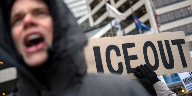 Des manifestants brandissant une grande pancarte anti-ICE, le 18 janvier 2026 à Minneapolis, dans le Minnesota. JIM VONDRUSKA / GETTY IMAGES VIA AFP
