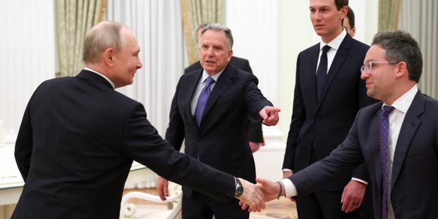 Vladimir Poutine, Steve Witkoff, Jared Kushner et Josh Gruenbaum à Moscou, le 22 janvier 2026. ALEXANDER KAZAKOV / AFP