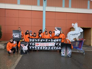 Un message destiné à rappeler que la réduction que demandent les défenseurs des animaux porte sur le nombre d’animaux abattus pour l’enseigne. Les militants de L214 ont exposé un lapin géant en carton devant le magasin. Pour Ambre Bernard, chargée de campagnes agroalimentaires pour L214 : “Filière Qualité ? On devrait plutôt parler de ‘Filière Cruauté’ ! Derrière les labels et les communications trompeuses de Carrefour, les lapins sont encore massivement élevés dans de minuscules cages. Mais l’élevage intensif ne concerne pas seulement les lapins. Chaque mois, environ 10 millions d’animaux sont tués pour approvisionner les rayons de l’enseigne. Pour atteindre un si grand nombre, Carrefour s’appuie très largement sur l’élevage intensif.”