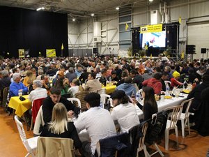Dès 19 heures, presque toutes les places avaient déjà trouvé preneur autour des tables et des buvettes. “On est 1030 d’après la police et les organisateurs”, s’amuse Serge Bousquet-Cassagne, figure incontournable du monde agricole lot-et-garonnais. “Cette assemblée générale se tient dans un contexte morose. On est ensemble et on se réchauffe ! “, précise l’ancien président de la chambre d’Agriculture. “Cette assemblée générale est marquée par une nouvelle présidence nationale. Une présidence de rupture, plus musclée. Une ligne qui nous convient bien dans le Lot-et-Garonne.”