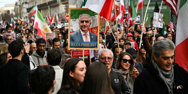 Une banderole « Iran, vie, liberté avec Reza Pahlavi », l’héritier du shah d’Iran, ouvrait le cortège, une autre « Make Iran Great Again » avec le visage de Pahlavi, son père et son grand-père était aussi déployée.