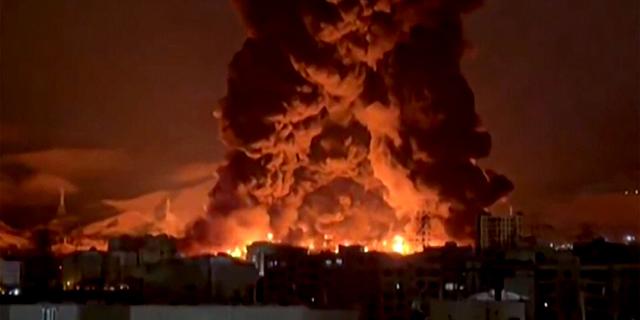 Images d’un dépôt pétrolier en feu, dans la nuit du dimanche 8 mars à Téhéran. -/AFP