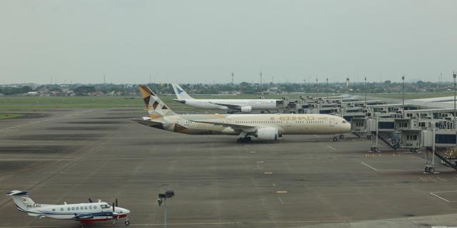 Des avions censés décoller pour des destinations au Moyen-Orient stationnent à l’aéroport international Soekarno-Hatta après l’annulation de plusieurs vols vers Dubaï et Doha, à Tangerang, en Indonésie, le 2 mars 2026. AGOES RUDIANTO / NURPHOTO VIA AFP