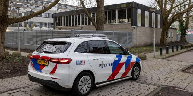 Une voiture de police garée devant une école juive où une explosion a été signalée, à Amsterdam, aux Pays-Bas, le 14 mars 2026. MICHEL VAN BERGEN / AFP