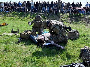 Sous le soleil et les rafales du vent d’autan, la simulation d’un théâtre d’opérations a permis de conclure les enseignements. Dans le scénario proposé, une section de dix militaires, casqués et armés, avançait autour d’un véhicule blindé avant d’être attaquée par surprise. Cinq blessés doivent être pris en charge pour des motifs différents : plaies multiples par balles, brûlures au niveau de la face et du thorax, éventration, blessure au bras, stress aigu.