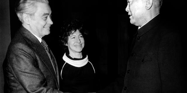 Li Xiannian (à droite), membre de l’Assemblée populaire nationale et président de la République populaire de Chine de 1983 à 1988, serre la main du réalisateur néerlandais Joris Iven (à gauche), aux côtés de la réalisatrice française Marceline Loridan, le 19 janvier 1977 à Pékin. XINHUA / AFP