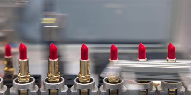 Des rouges à lèvres sur les chaînes de montage du centre de production de l’usine L’Oréal à Ormes, dans le centre de la France. GUILLAUME SOUVANT/AFP