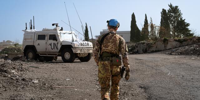 Un casque bleu de l’ONU près d’un véhicule de patrouille, au sud du Liban, le 22 février 2026. SILVIA CASADEI / MIDDLE EAST IMAGES VIA AFP
