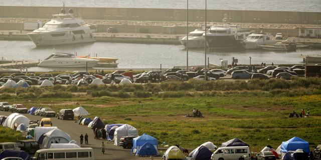 Le 4 avril 2026 à Beyrouth : des tentes de camping, abris de personnes qui ont fui le sud du Liban et la banlieue sud de Beyrouth, face à des yachts dans la baie de Zaytona. 1,2 million de personnes ont quitté leurs habitations au Liban depuis que le Hezbollah a rejoint le conflit entre Israël et l’Iran le 2 mars. MARWAN NAAMANI/ZUMA/SIPA