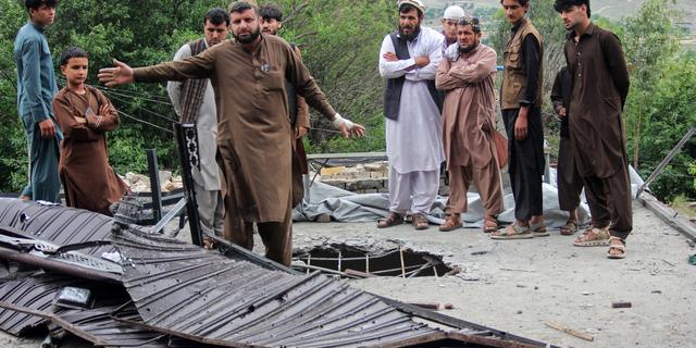 Des Afghans inspectent une maison détruite dans la province de Kunar, le 28 avril 2026. AIMAL ZAHIR / AFP